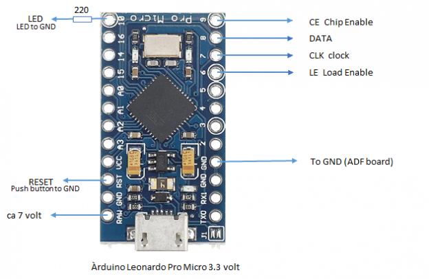 Şema basittir. Veri, LE ve CLK, ADF kayıtlarını doldurmak için kullanılır. CE (= Chip Enable) ile ADF kilidi açılır. ADF’nin CE bağlantısı ayrıca 3,3 voltluk hatta sürekli olarak bağlanabilir.