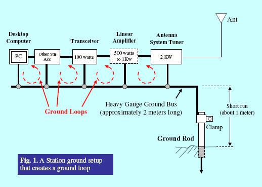 Bu amatör telsiz operatörü titiz bir adamdı. Bir gün, sonunda XYL’yi, aile çocuklarının meraklı bakışlarından ve kaşınan parmaklarından uzakta, radyo kulübesini kurmasına izin vermeye ikna etti. Böylece radyo odasını QTH evinin zemin katına kurdu. Ekipmanlarını düzenledi ve düzgünce sıralanmış istasyon ekipmanlarının hemen arkasına yaklaşık 3 metre uzunluğunda kalın bir bakır kablo döşeyerek iyi bir elektrik topraklama sistemi oluşturdu. Topraklama kablosunu düz bir şekilde döşemeye karar verdi, böylece her bir ekipmanın topraklama pabucu, topraklama barasına ulaşmak için kısa ve esnek bir topraklama kablosuna yer sağlayabilirdi. Bunu, tüm istasyon ekipmanlarına, her bir topraklama kablosunun birbirine karışıp dolanmaması için çok düzgün bir bağlantıyla yaptı. Topraklama barasının kalan kısmı, radyo odasının duvarının yakınındaki, hemen dışarıdaki etkili bir şekilde sürülen bir topraklama çubuğuna kadar dışarıya uzatıldı. Bu topraklama düzeni, Şekil 1’de gösterilene benziyordu.