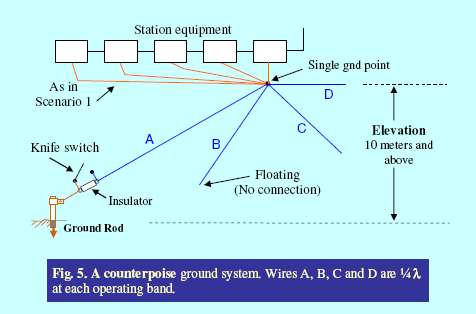 Bu topraklama tekniği, amatör radyonun tarihi kadar eskidir. Bu tekniğin kullanımı 1895 yılına kadar uzanır. Toprak iletkenliği zayıf olduğunda daha etkili bir şekilde kullanılır. Ancak anteninizin topraktan daha yüksek bir rakımda verimli bir şekilde yayılım gösterebilmesi için bir RF topraklamasına da ihtiyacı olduğundan (bunun nedeni bu makalenin kapsamı dışındadır, ancak gelecekteki makalelerde ele alınabilir), iki işlevi yerine getirmek üzere kurulabilir. Yani, topraktan yüksekteyken anten için yapay bir topraklama sağlamak ve RF’yi istasyon ekipmanından uzak tutmak. Kurulum aşağıdaki Şekil 5’te gösterilmiştir.