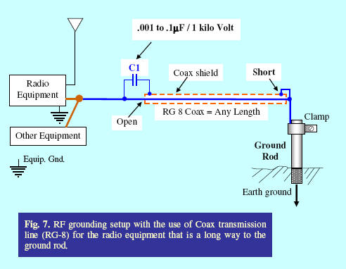 Bu, son yıllarda birçok amatör telsizci tarafından, özellikle de 2003 yılında makaleyi yayınlayan William Chesney/N8SA (bkz. http://www.hamuniverse.com/grounding.html) tarafından geliştirilen ve tanıtılan yaratıcı bir cihazın modern versiyonudur. Bu topraklama sistemi, amatör telsizcilikte hem elektriksel topraklama hem de RF topraklama gereksinimlerini karşılar. Cihaz, uzun topraklama kabloları için tasarlanmıştır. Topraklama cihazı, istasyon ekipmanının yakınında yüksek voltajlı duran dalgaların birikmesini önlemek için topraklama kablosunun RG-8 iletim hattı gibi bir kalkanla çevrelendiği bir koaksiyel hat kullanır. Bu topraklama hattı uzunluk hassasiyetine sahip değildir ve herhangi bir uzunlukta endişe duymadan kullanılabilir. RF’yi kulübeden uzak tutar. Bu pratik topraklama sisteminin kablolama düzeni aşağıdaki Şekil 7’de gösterilmiştir: