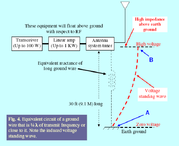 Topraklama teliniz 30 fit (9,1 metre) uzunluğundadır; bu uzunluk 7 MHz’de çeyrek dalga boyuna çok yakındır. Bu frekansta iletim yapmaya başladığınızda, verici kurulumunuz ve anten sisteminiz bu telin uzunluğu boyunca duran bir dalga görüntüsü oluşturacaktır. Bu, rezonans nedeniyle indüklenen RF voltajıyla gerçekleşir. Uzun topraklama teli iletim frekansında ¼ dalga boyu uzunluğundaysa, bu tel rezonansa girecek ve radyasyon yayan bir eleman gibi davranacaktır. Topraklama teli çeyrek dalga boyundan daha kısaysa, topraklamada değeri “Sıfır” (“A noktası”) ve ekipmanın devre topraklama noktasında “Yüksek” olan bir endüktif reaktans olarak görünecektir (Bkz. Şekil 4, “B noktası”).