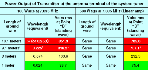 Aşağıda (Tablo 1’e bakın), farklı uzunluklarda topraklama kablosu kullandığınızda ve kulübenizde aynı parametreler mevcut olduğunda “B” noktasında oluşan voltaj sabit dalgaları gösterilmektedir. Voltaj değerleri, dalga boyu faktörü kullanılarak enterpolasyon yoluyla hesaplanmıştır.