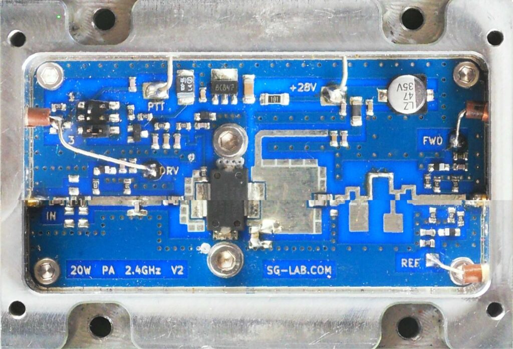 Bulgar SG-Lab firmasının 2,4 GHz 20 W güç amplifikatörü, OM’ler (QO-100 uydu fanları dahil) arasında yaygın olarak kullanılmaktadır [1]. Cazip fiyatının yanı sıra, bu durum frezelenmiş alüminyum gövdedeki mükemmel işçilik ve teslimattan da kaynaklanmaktadır. PA, giriş, çıkış ve yansıyan gücü ölçmek için üç dahili yönlü bağlantı elemanı içerir.