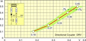 Yönlü kuplör DRV’nin kalibrasyon eğrisi (kırmızı) Şekil 2’de, FWD eğrisi ise Şekil 3’te gösterilmiştir. Ölçüm noktaları bana SG-Lab.com tarafından sağlanmıştır ve birçok kopyanın ortalamasını temsil etmektedir. REF kuplörü aynı şekilde yapılandırıldığı ve FWD kuplörüne simetrik olarak yerleştirildiği için aynı karakteristiğe sahip olabilir. Ancak genel olarak, yüksek yansıyan güçlü bir REF’in (SWR) transistör çıkış katını öldürebileceği unutulmamalıdır. Hata toleransı, voltaj değerlerine bağlı olarak ± %7 olmalıdır. Karakteristik eğrinin dikliği nedeniyle, güce göre hata buna bağlı olarak daha büyüktür (yeşil alan). Kuplörün seçiciliği olarak 22 dB – 25 dB değeri belirtilmiştir.