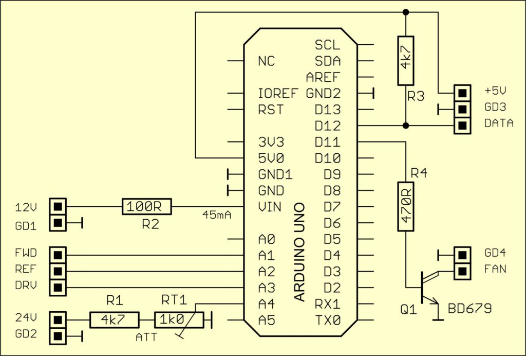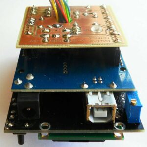 Devre (Şekil 5), geleneksel kablolama ile bir ızgara kartı üzerine kurulabilir. “Alt kalkan” kullanımı daha şıktır. 4 pinli başlıklarla donatılmış bir devre kartıdır. Bu, soket şeritlerine lehimlenmiş Arduino Uno’nun iç ped sırasına alttan takılır (Şekil 6).