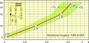 Yönlü kuplör DRV’nin kalibrasyon eğrisi (kırmızı) Şekil 2’de, FWD eğrisi ise Şekil 3’te gösterilmiştir. Ölçüm noktaları bana SG-Lab.com tarafından sağlanmıştır ve birçok kopyanın ortalamasını temsil etmektedir. REF kuplörü aynı şekilde yapılandırıldığı ve FWD kuplörüne simetrik olarak yerleştirildiği için aynı karakteristiğe sahip olabilir. Ancak genel olarak, yüksek yansıyan güçlü bir REF’in (SWR) transistör çıkış katını öldürebileceği unutulmamalıdır. Hata toleransı, voltaj değerlerine bağlı olarak ± %7 olmalıdır. Karakteristik eğrinin dikliği nedeniyle, güce göre hata buna bağlı olarak daha büyüktür (yeşil alan). Kuplörün seçiciliği olarak 22 dB – 25 dB değeri belirtilmiştir.